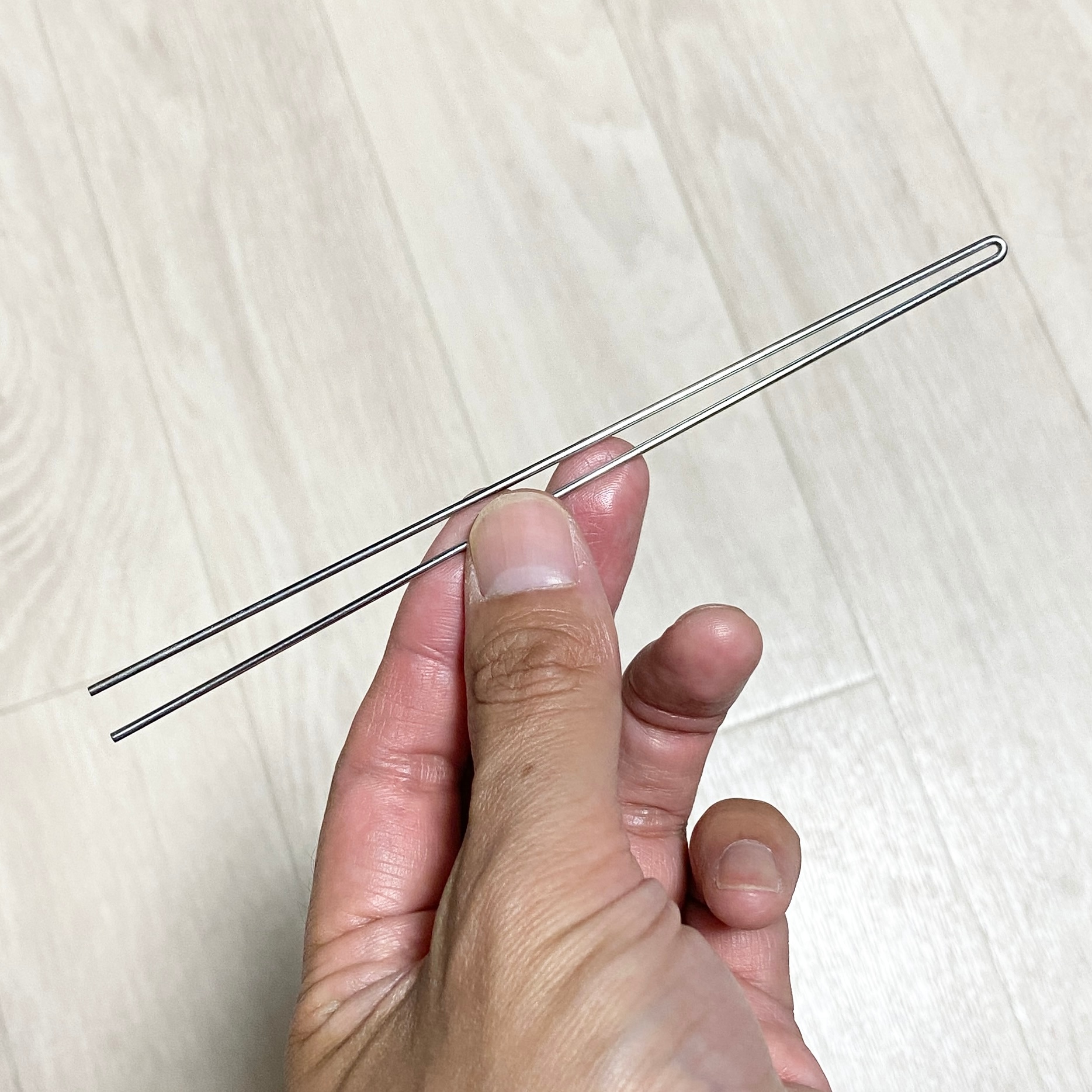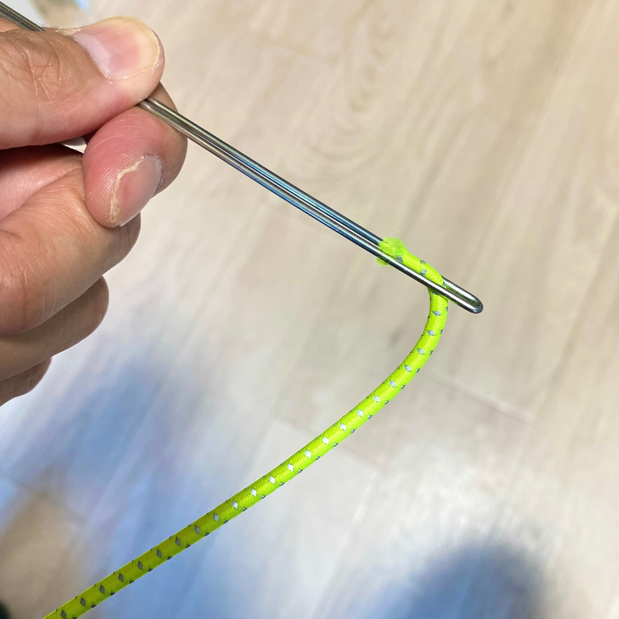 使用する道具は、野球のグローブ用の紐通し。僕はまったく野球をしてこなかった人生なので詳しくは分かりませんが、替えの紐を買うとついてくるぐらいのお手軽なアイテムのようです。