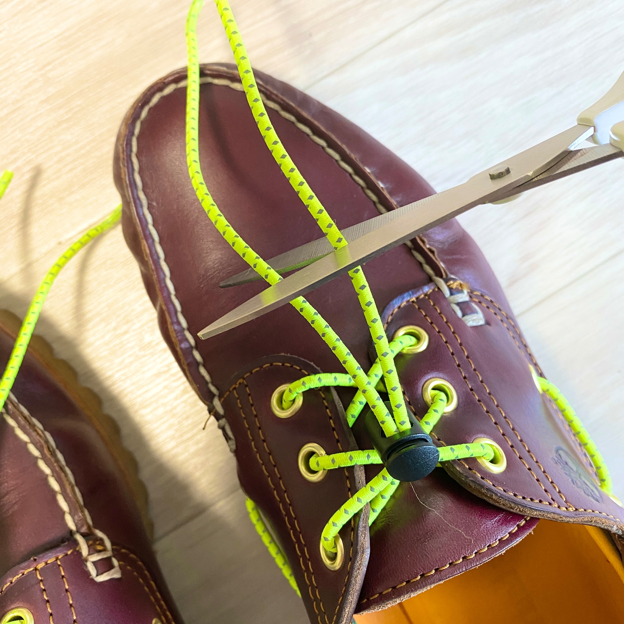 紐通しと平行になるようにシューレースを挟むのがポイント。そうしないとシューホールにうまく通りません。