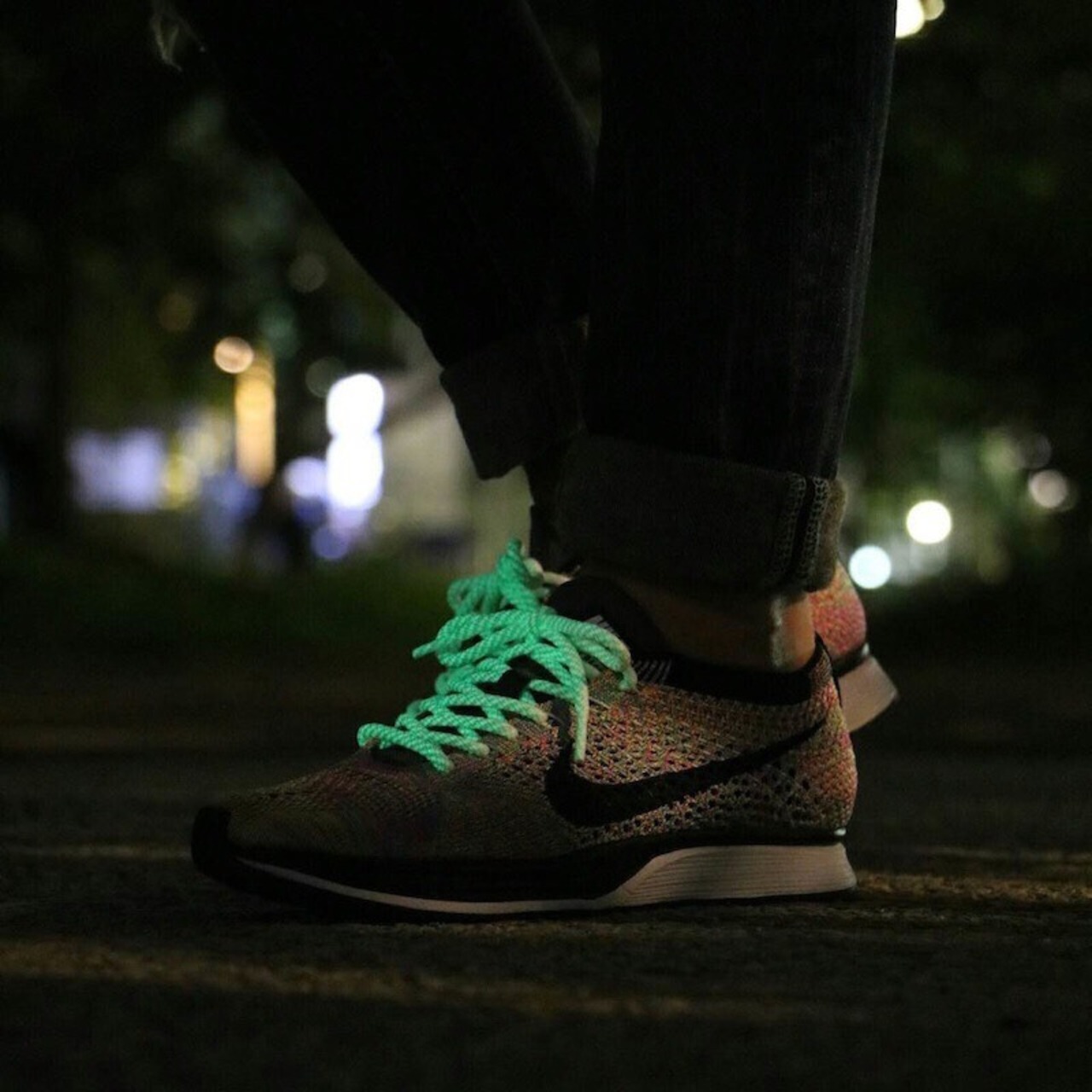 通常はホワイト1色に見えるシューレースは、ベースとなる部分が蓄光糸で編み込まれ光を溜め込み、暗闇に入った時にうっすらグリーンがかった光を放出します。