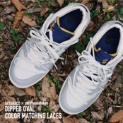 今回GETABACOとのコラボレーションにより、アッパーのグレーに合わせた「Grey」のOval Lacesとソールやメッシュ部に使われているオフホワイトカラーに色合わせした「Off White」のOval Lacesを作成しました。